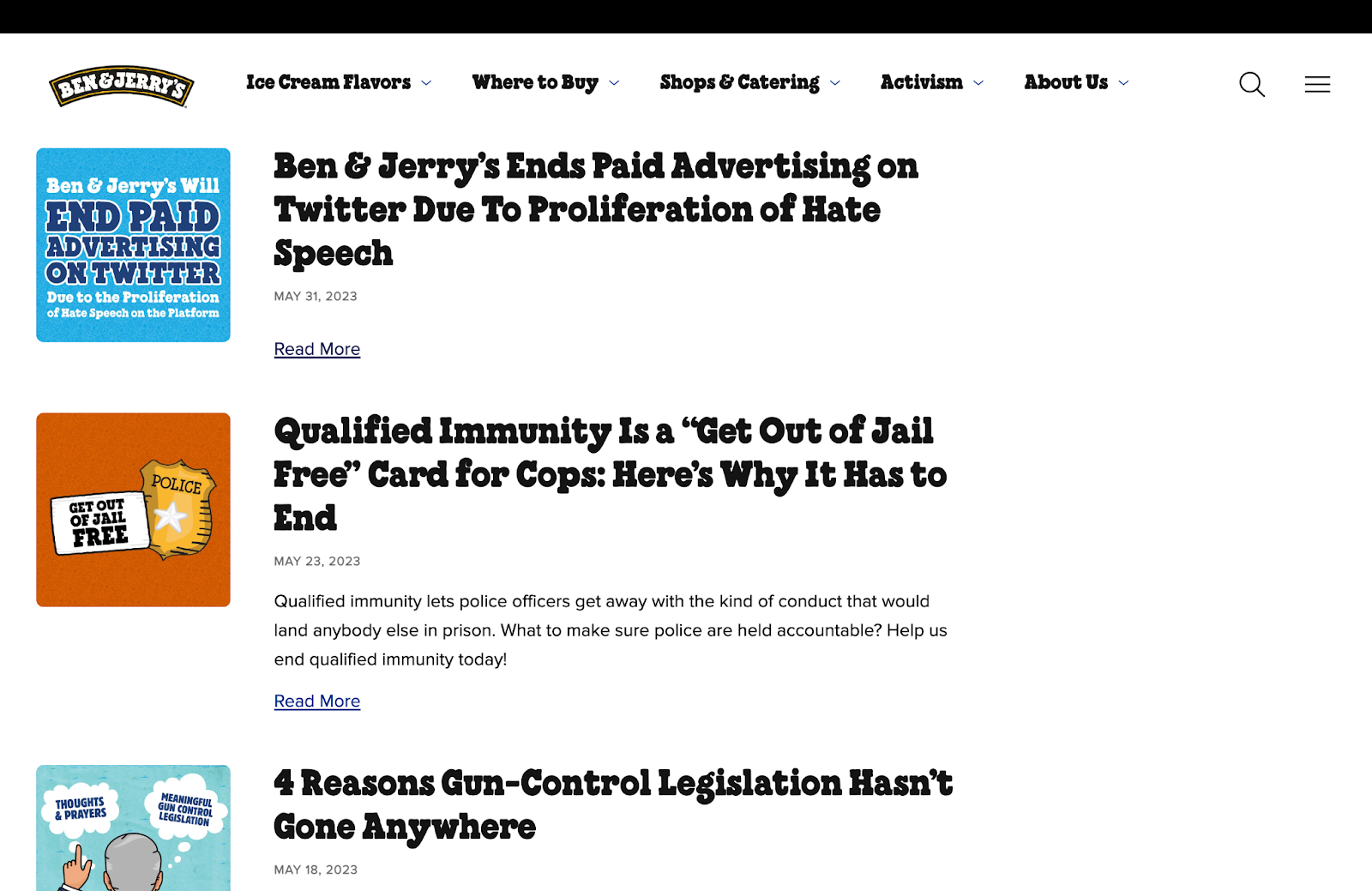 Between blog posts about ice cream news and recipes to try, for instance, Ben & Jerry’s seamlessly weaves in articles with important information about current events and how folks can join in on the fight for what’s right — without mincing any words about what truly matters to the company.