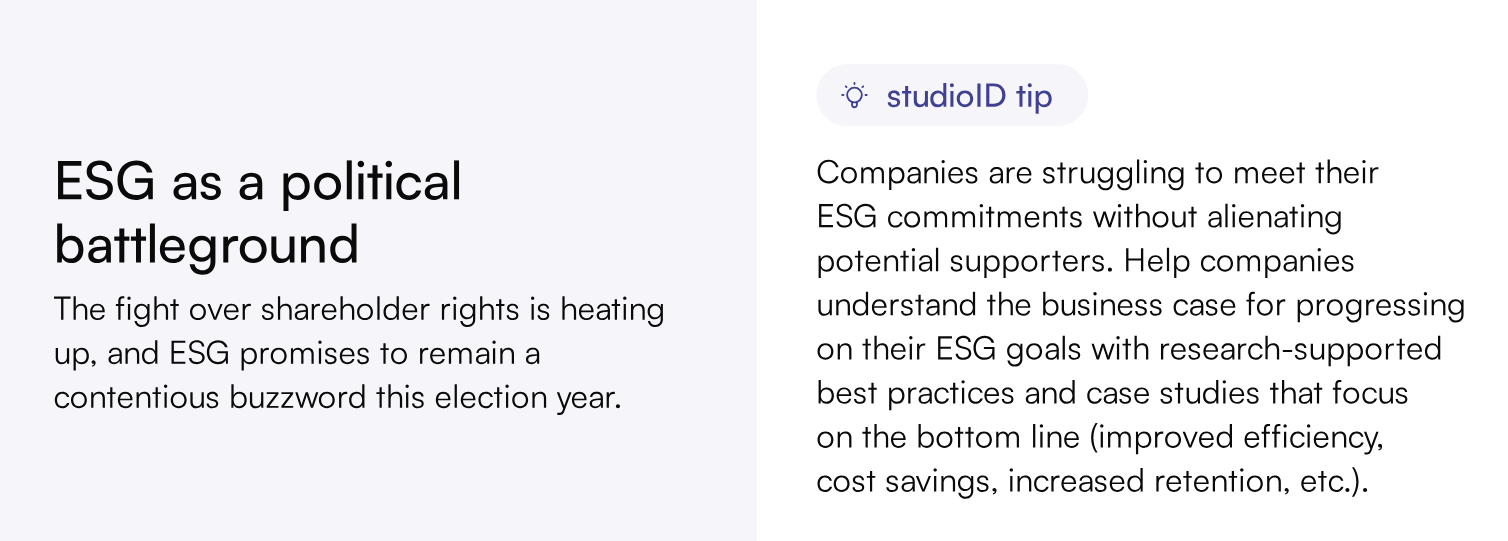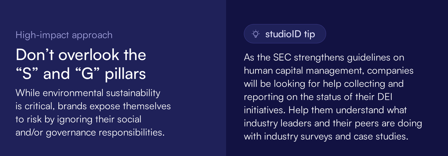 And if you think greenwashing is an option, think again. “Leaders need to be transparent, but their narratives and promises must be backed by action,” according to the ESG Dive Audience Spotlight. To break through the noise, “Guide leaders away from greenwashing by showing them examples of companies that have been called out and/or fined for making empty promises. More importantly, show them how you can help them accurately meet reporting requirements and chart a path toward meaningful impact.”