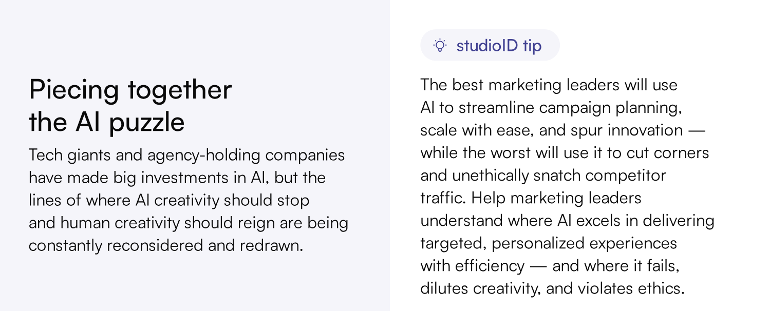 Instead of falling for the hype (or deep fakes), take a more pragmatic approach to AI and genuinely guide your audience through the new territory. “Marketing leaders need even-keeled, realistic assessments of the technology’s current sweet spots, limitations/cautions, and actual ROI.