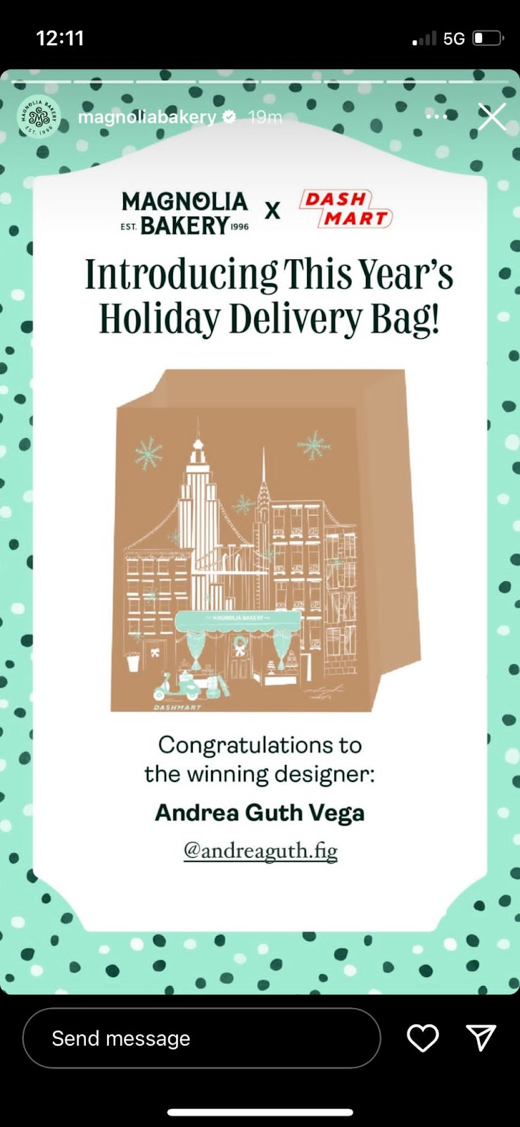 The premise? An illustration to adorn the brand’s shopping bags during holiday season. And the promise? “In addition to having your artwork delivered to thousands of people’s doors throughout the city, [the] First Place winner will receive a $600 cash prize and promotion on Magnolia Bakery’s Instagram.”