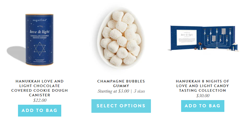 Coupled with seamless on-site content that matches the email visually and in tone, Sugarfina makes their Hanukkah offering look natural and fun — which is exactly what Rosenfeld recommends. Instead of trying too hard with overwrought tips and tricks, the brand creates a tasteful experience that highlights the things that makes Hanukkah truly special, with thoughtful mention of kosher-friendly treats.