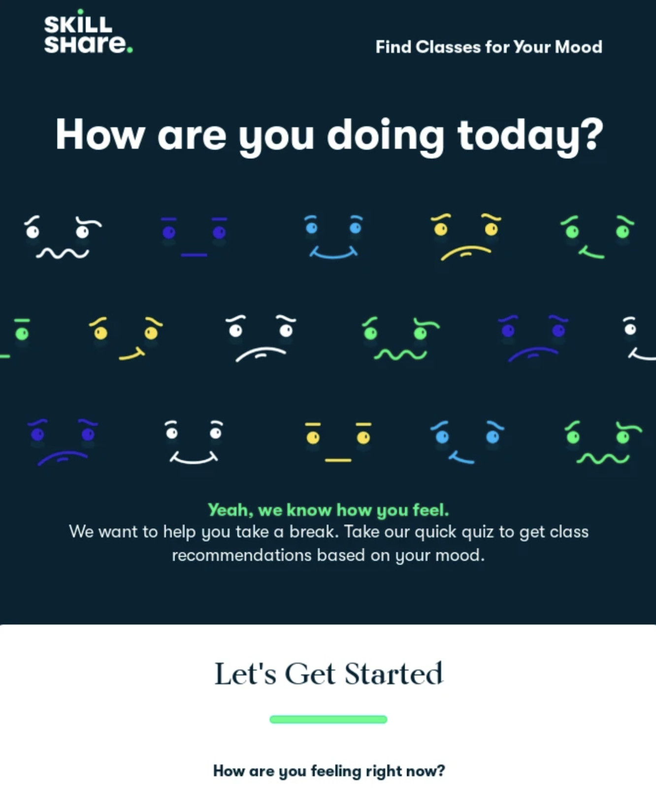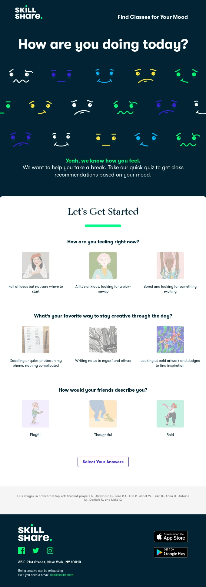This is a stellar example from Skillshare, a learning community for creators, that uses a quiz to gather more information about their leads so they can provide them with more customized content. Knowing the power of personalization, this is an intelligent strategy.