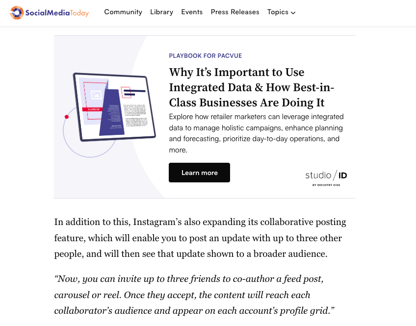 Promote your content, like events, activations, and campaigns, to increase exposure. Content amplification usually involves using pay-per-click ads directly in the publication, which is more effective than advertising on a broader network like Google due to the targeted audience. Whether you’d like to advertise your evergreen content hub or a webinar on a pointed topic, amplifying it in publications can increase brand awareness and align your brand with trusted sources.