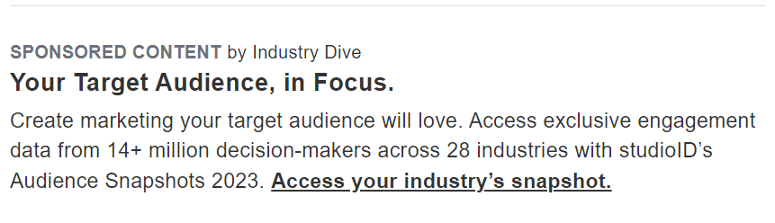 Take Industry Dive’s promotion of Audience Snapshots 2023 in Marketing Dive’s newsletter. Readers of Marketing Dive click on the newsletter ready to learn the latest marketing news, tip, and tricks. This sponsored promotion directly scratches that itch of addressing a marketer’s pain point by dangling insights from their target audience.