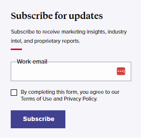 “Subscribe to receive marketing insights, industry intel, and proprietary reports.” This description tells the potential customer exactly what they’ll receive when they subscribe. The message is supplemented by a clear CTA to “subscribe” both in the headline and the button.