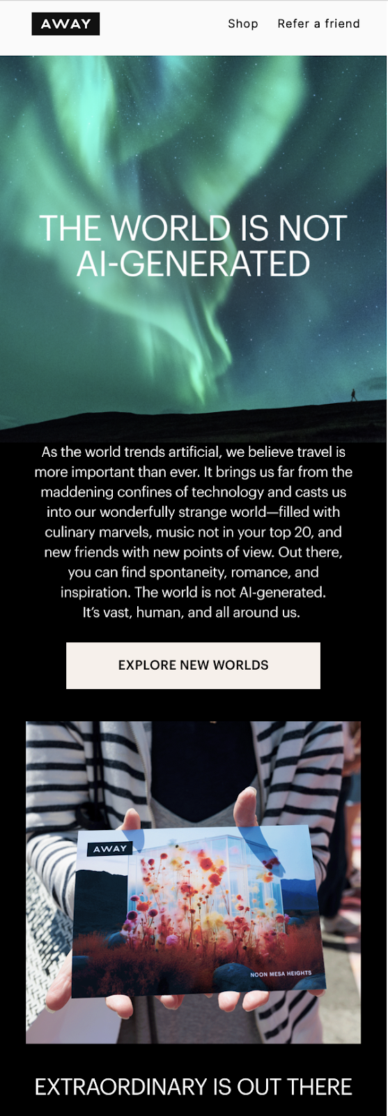 “While many brands have experimented with AI in various ways,” Dunham says that “At Away, we felt it was important to share our perspective on AI in a way that reinforces our core belief: that the more you travel, the better we all become.