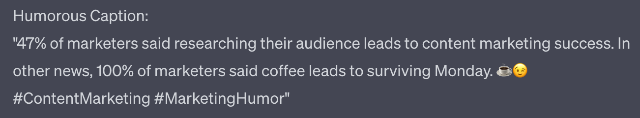 Let’s see what this looks like in practice. In this example, we started by asking ChatGPT to create a social caption for an article. The additional parameters instructed were to use a statistic from the article and give the whole caption a humorous tone. Its output was as follows: