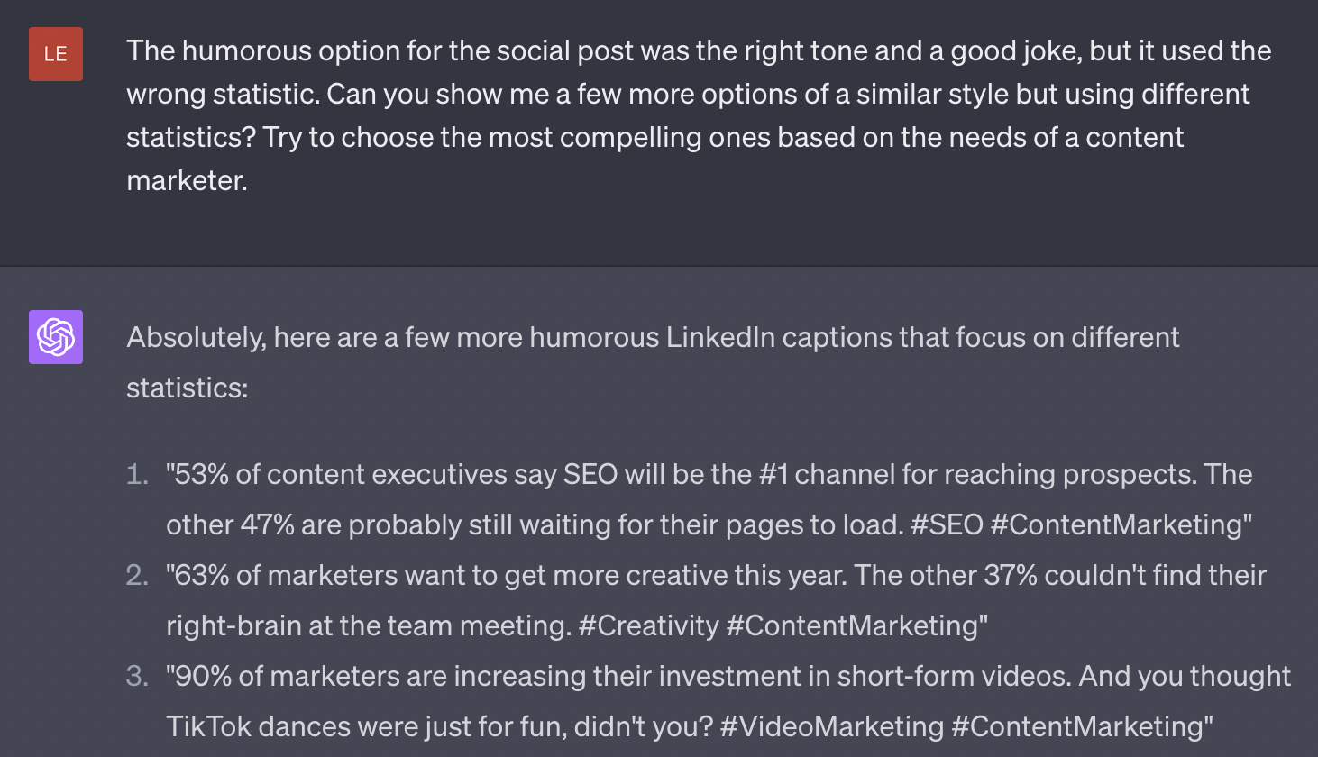While there’s no accounting for taste, it got the humor part of the prompt down. However, we’re not loving the statistic ChatGPT gave us. To correct this, reply to ChatGPT directly and ask it to give you more humorous options with other statistics. By telling ChatGPT what was right and what was wrong, it can more accurately course-correct and deliver what you’re looking for.