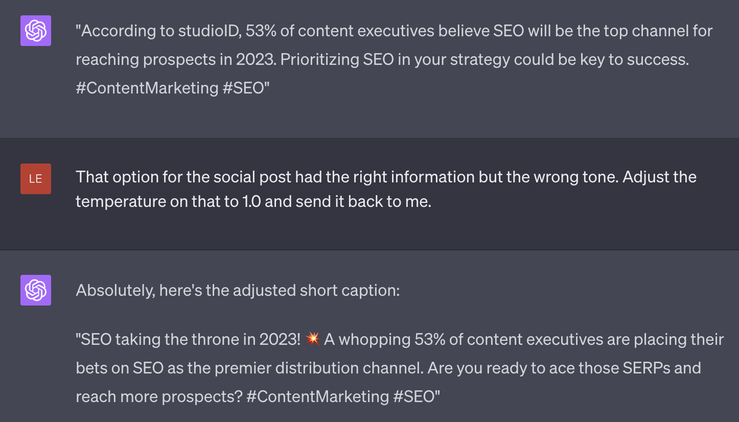 Once again, we must start by informing ChatGPT what was right — and what was wrong — with its first attempt. By explaining that and then prompting it to adjust the temperature upward, we get a more creative, exciting option for our social post.