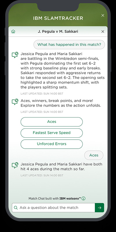 Match Chat invites tennis fans to take a swing with pre-written prompts or ask their own questions and is available on the Wimbledon App and wimbledon.com. Responses, alongside a match analysis, are instantly generated, offering insights to enrich the fan experience. Built using watsonx Orchestrate, a gen AI and automation solution from IBM, Match Chat is trained on the Wimbledon editorial style and the language of tennis, ensuring each reply hits the mark.