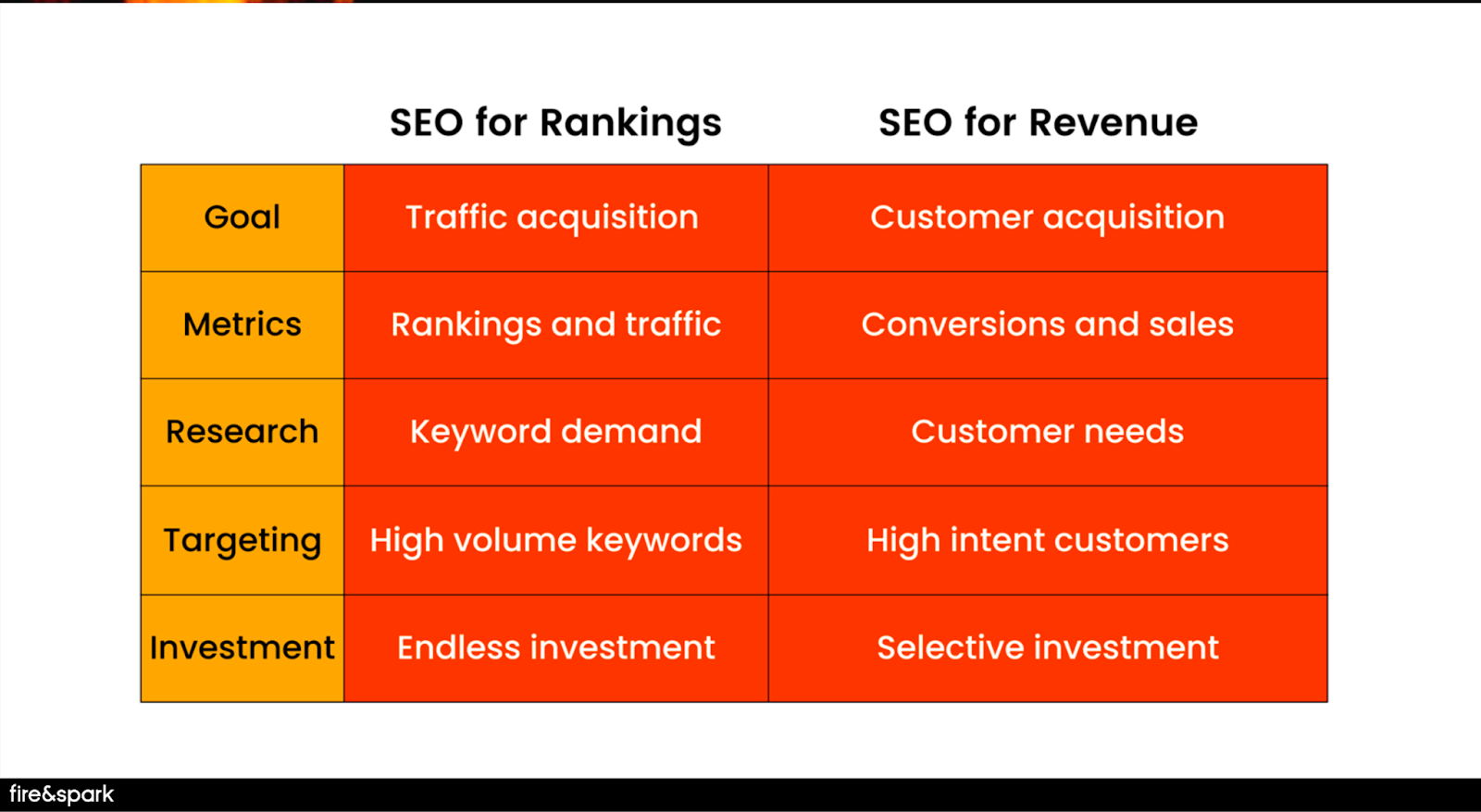 Bertrand provides a helpful chart to help you understand how to adjust your SEO strategy and goals for a revenue-focused mindset.