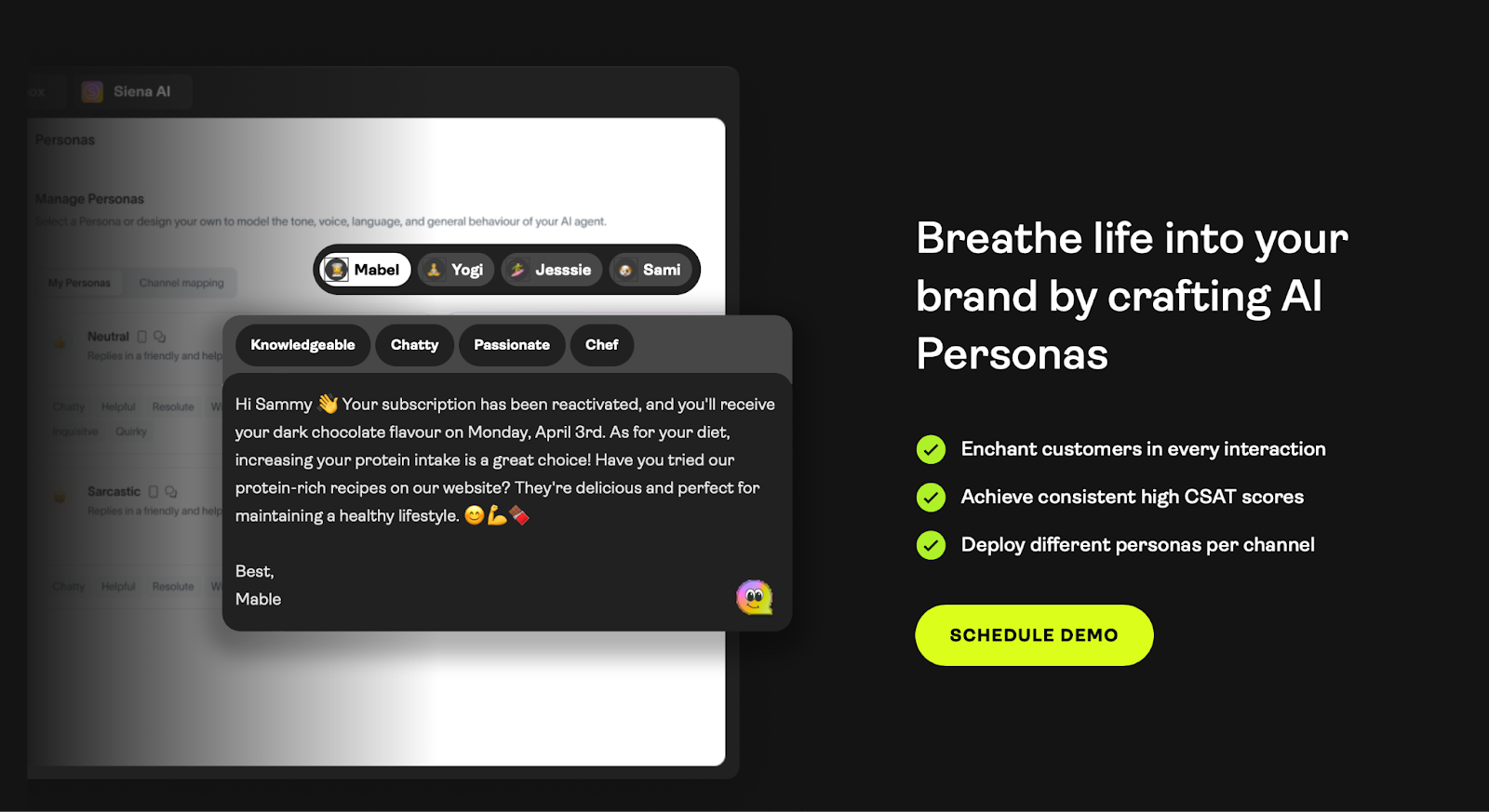 With Siena, marketing teams create personas based on brand voice, channel, and customer base. In other words, their AI chatbot sounds like a real person who speaks with the brand voice and uses branded terminology. Brands like Japan Crate, Kit*ch, and Simple Modern report increased customer satisfaction ratings with Siena’s responses and a faster time to resolution.