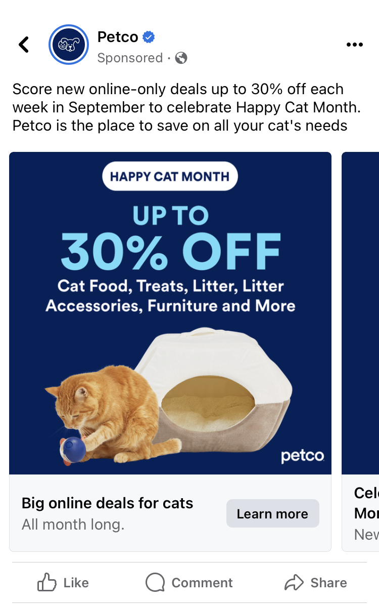 Petco runs retargeting ads based on past purchases and other customer behaviors. If your Facebook is full of cat photos and shares from a local cat rescue, Petco will target you with ads about cat toys, food, and litter.