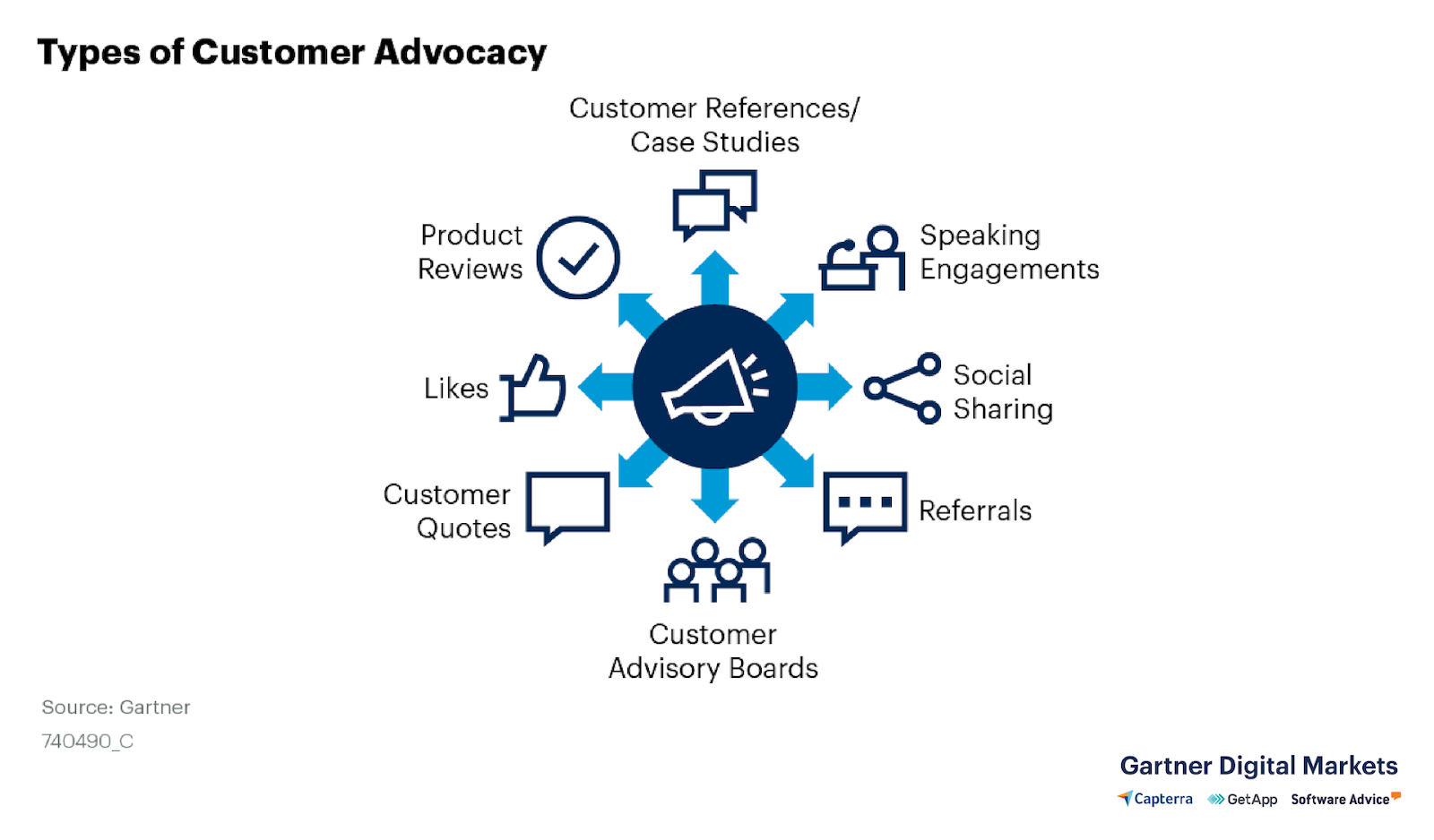 Customer advocacy is all about encouraging your customers to promote your brand because they genuinely love the product or service. According to Gartner, this can look like case studies, referrals, product reviews, and customer advisory boards.