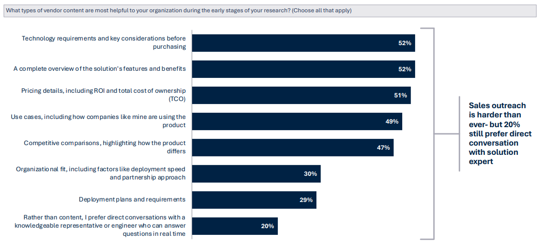One of the key outcomes of this shift is the rise in self-education among buyers. According to a 2025 Media Consumption Survey, 80% of tech buyers say the information they find online is sufficient to help them build vendor shortlists without needing to engage a sales rep. This highlights the growing importance of having a strong digital presence, as buyers are spending more time with independent sources and relying heavily on expert content to inform their decisions.