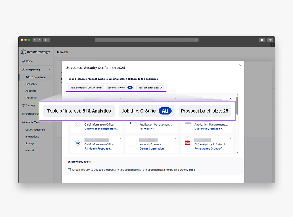 Automatically deliver Active Prospects who meet topic and job role criteria to a topically aligned Outreach sequence on a weekly basis