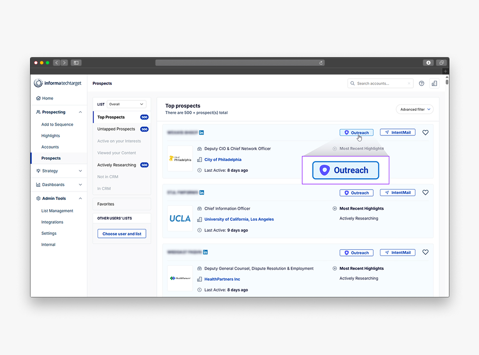 Immediately add one or more Active Prospects from Informa TechTarget Portal directly to a relevant Outreach sequence with the click of a button