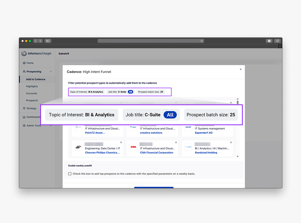 Automatically deliver Active Prospects who meet topic and job role criteria to a topically aligned Salesloft cadence on a weekly basis