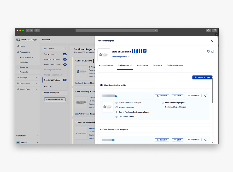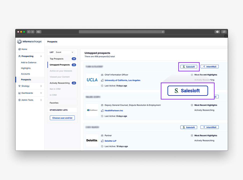 Immediately add one or more Active Prospects from Informa TechTarget Portal directly to a relevant Salesloft cadence with the click of a button